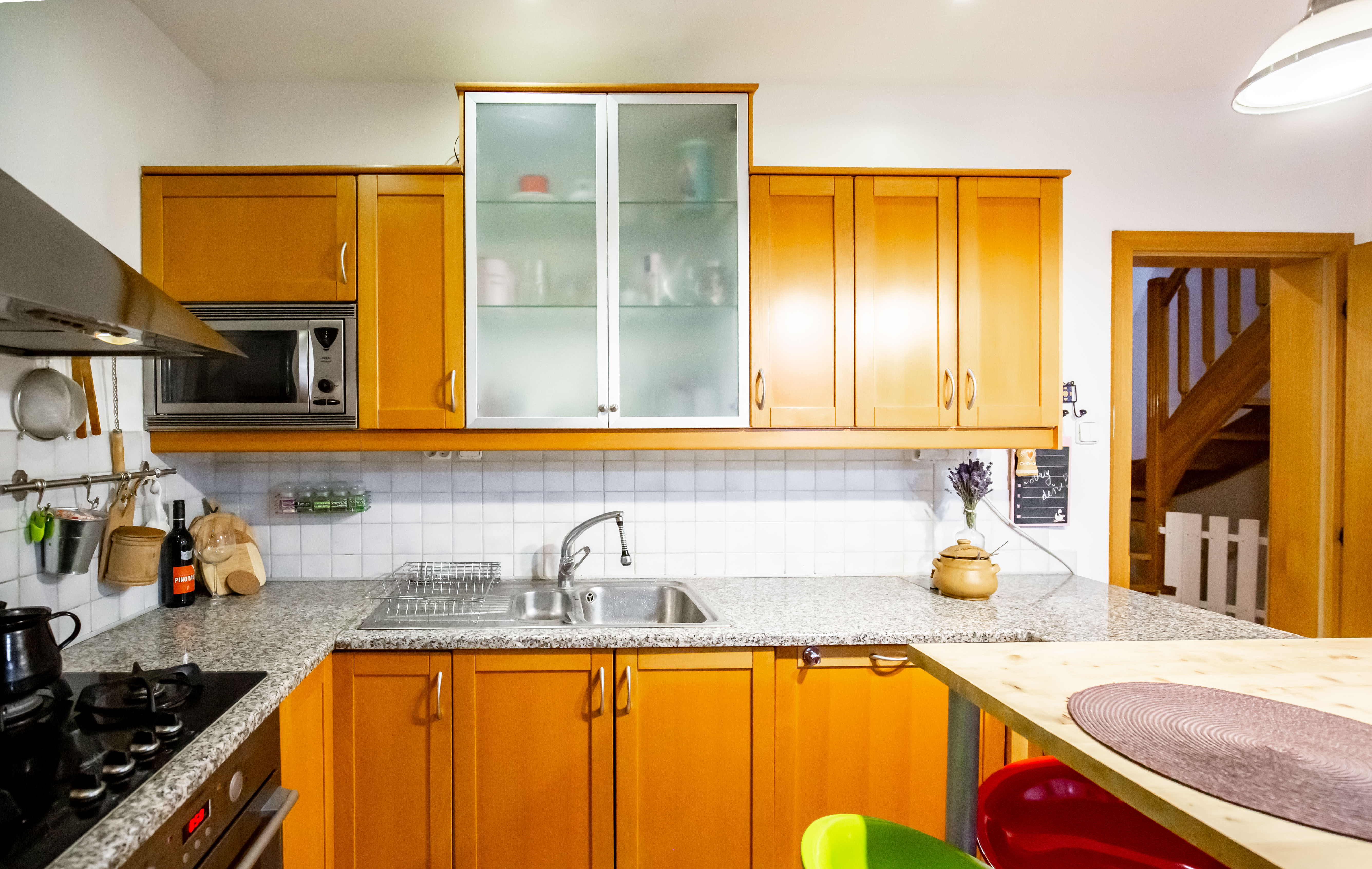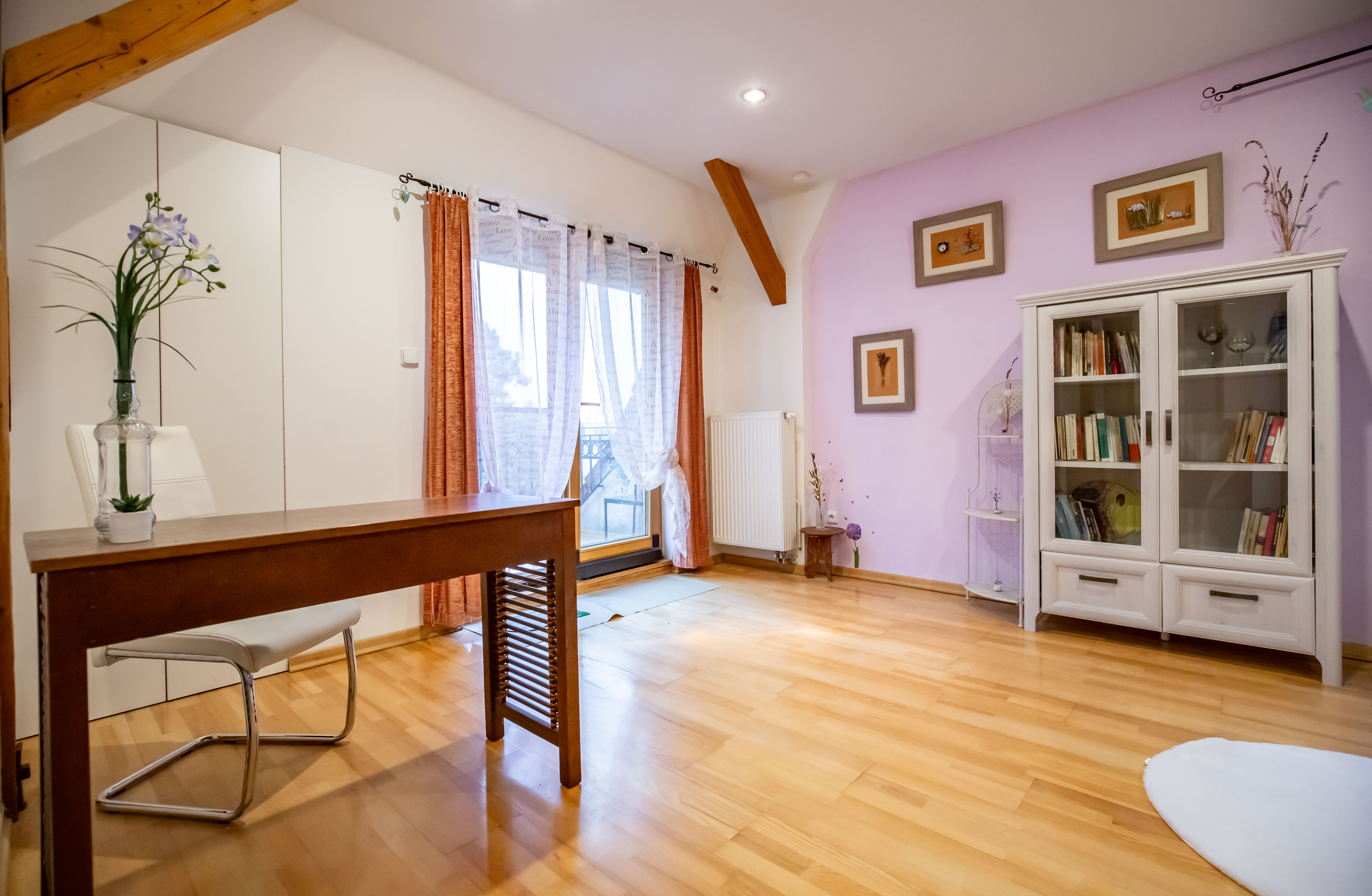 níkom, technická miestnosť, kuchyňa s komorou, kúpeľňa s vaňou a WC, krásna presvetlená obývacia izba ladená v Provensálskom štýle s výstupom na balkón a spálňa (pracovňa).