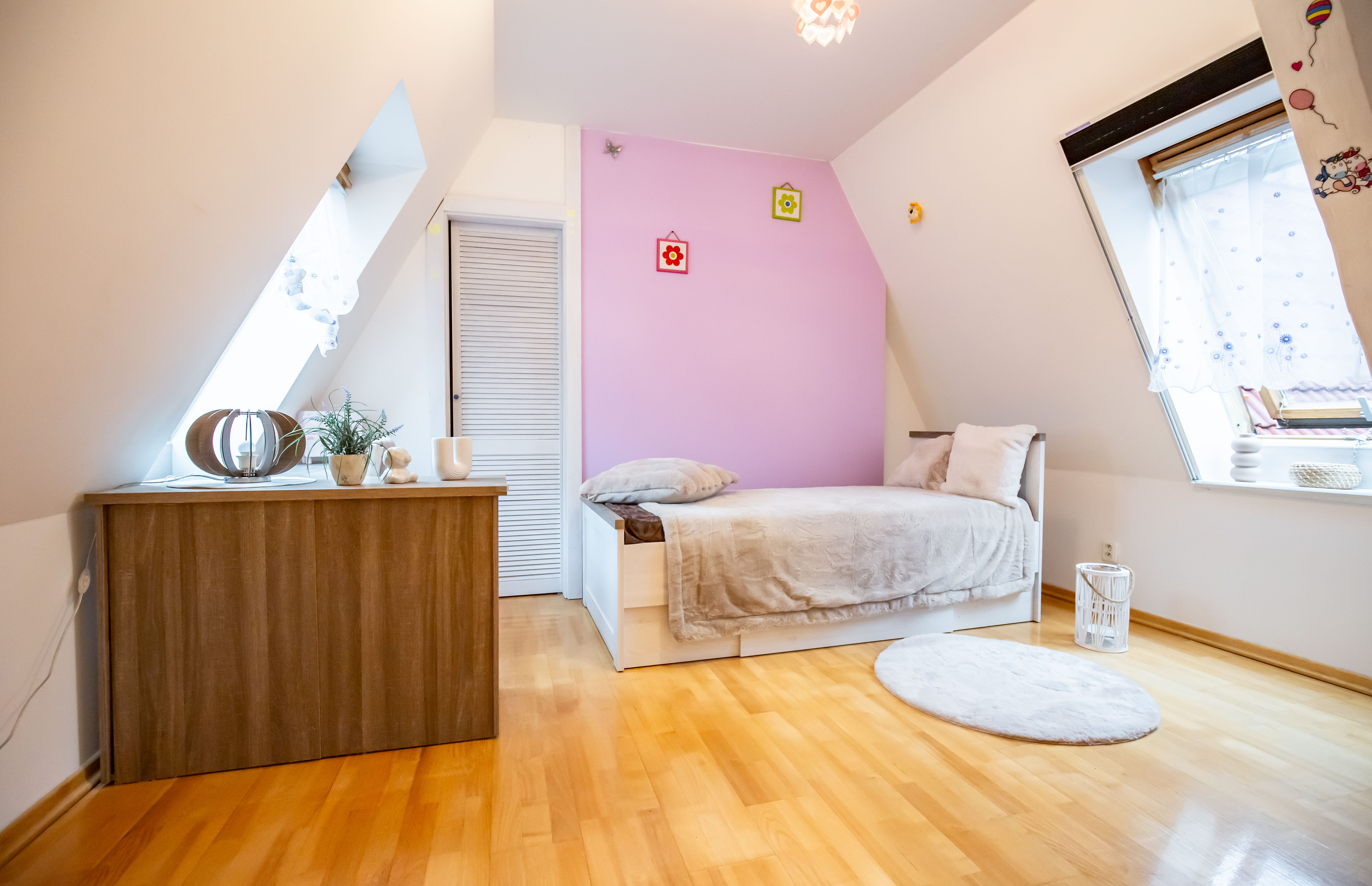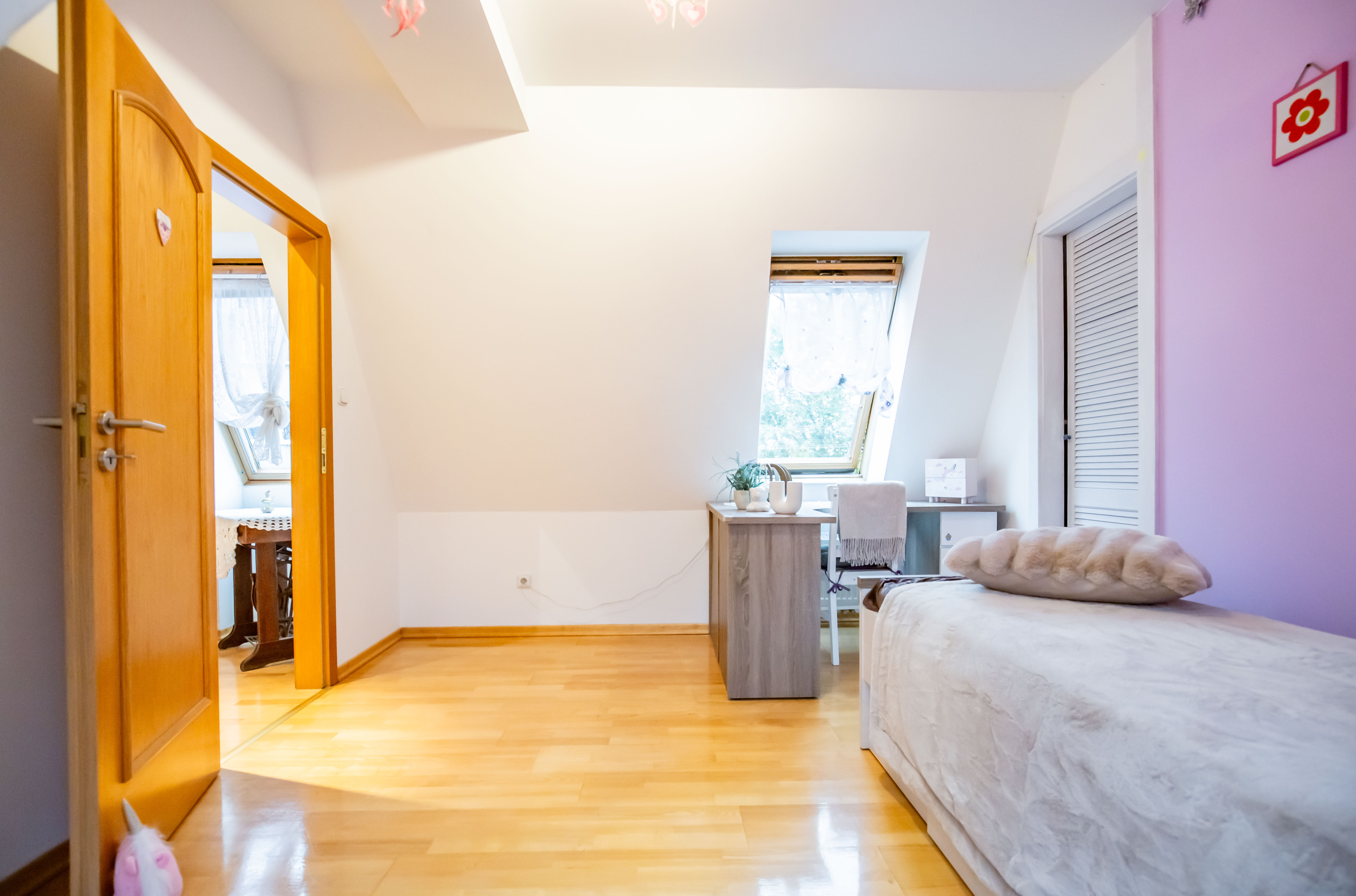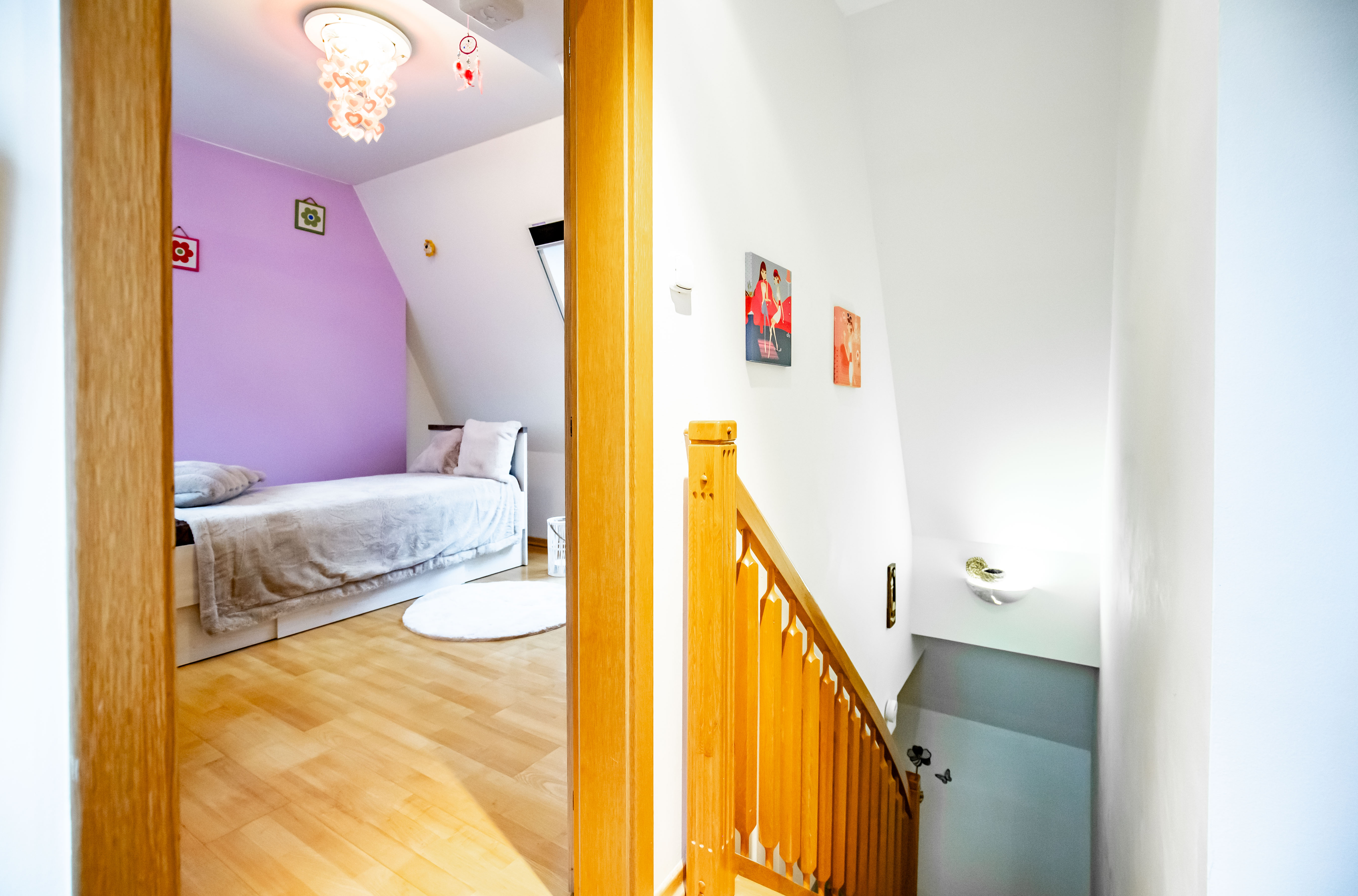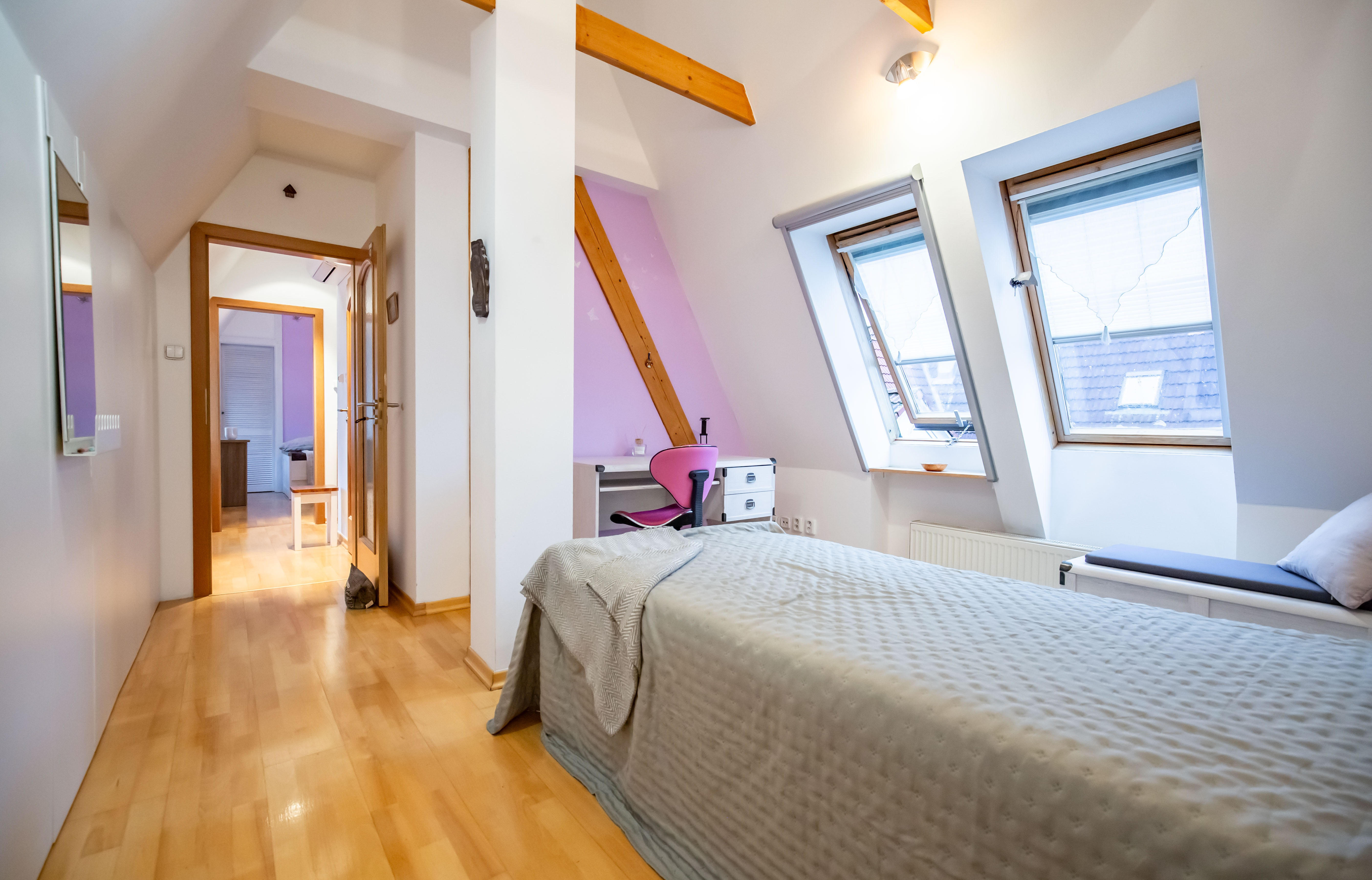 2.podlažie (40 m2): 2 detské izby, jedna aj so šatníkom, kúpeľňa so sprchovacím kútom, WC, bidetom a 2 umývadlami.