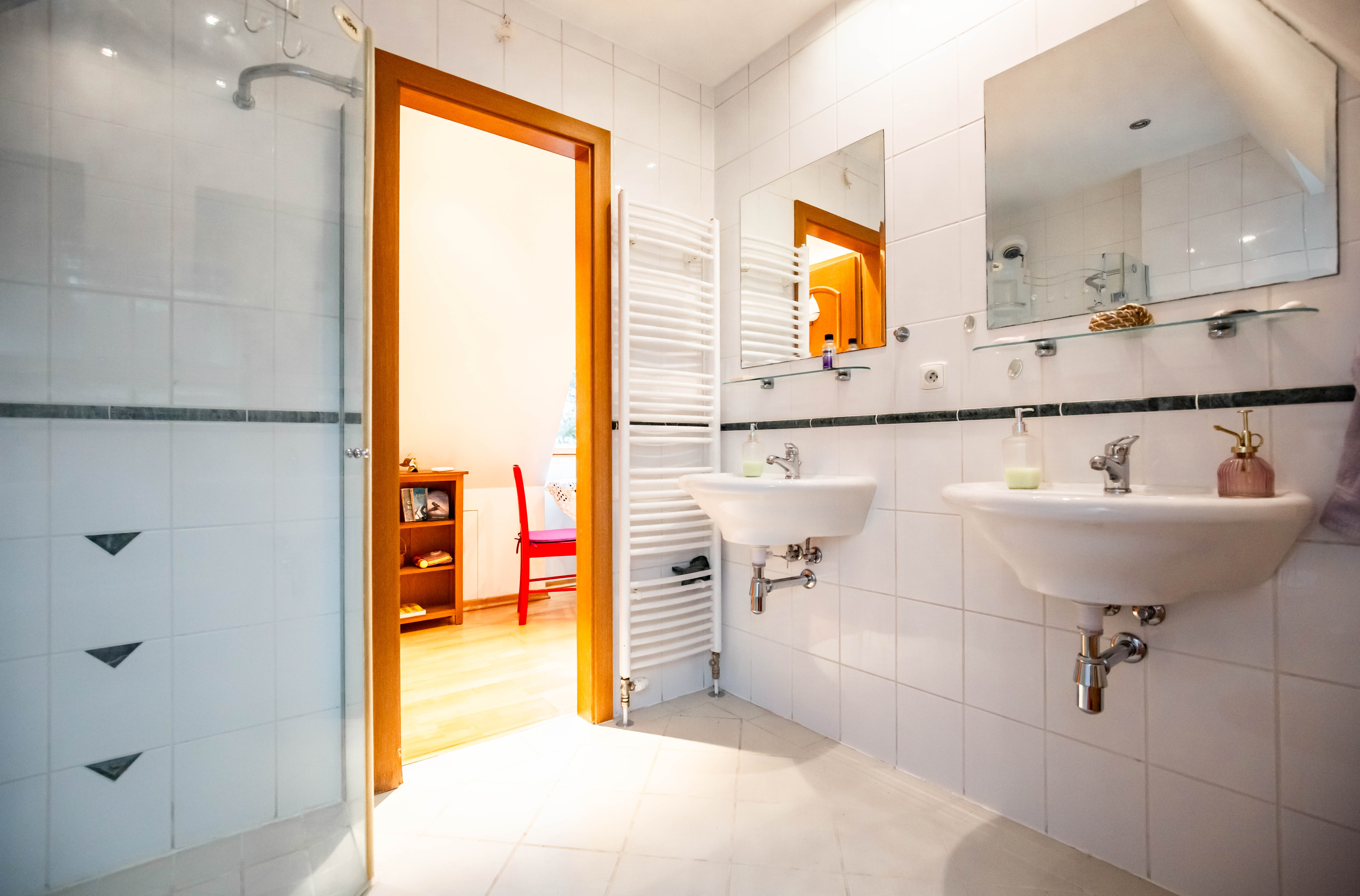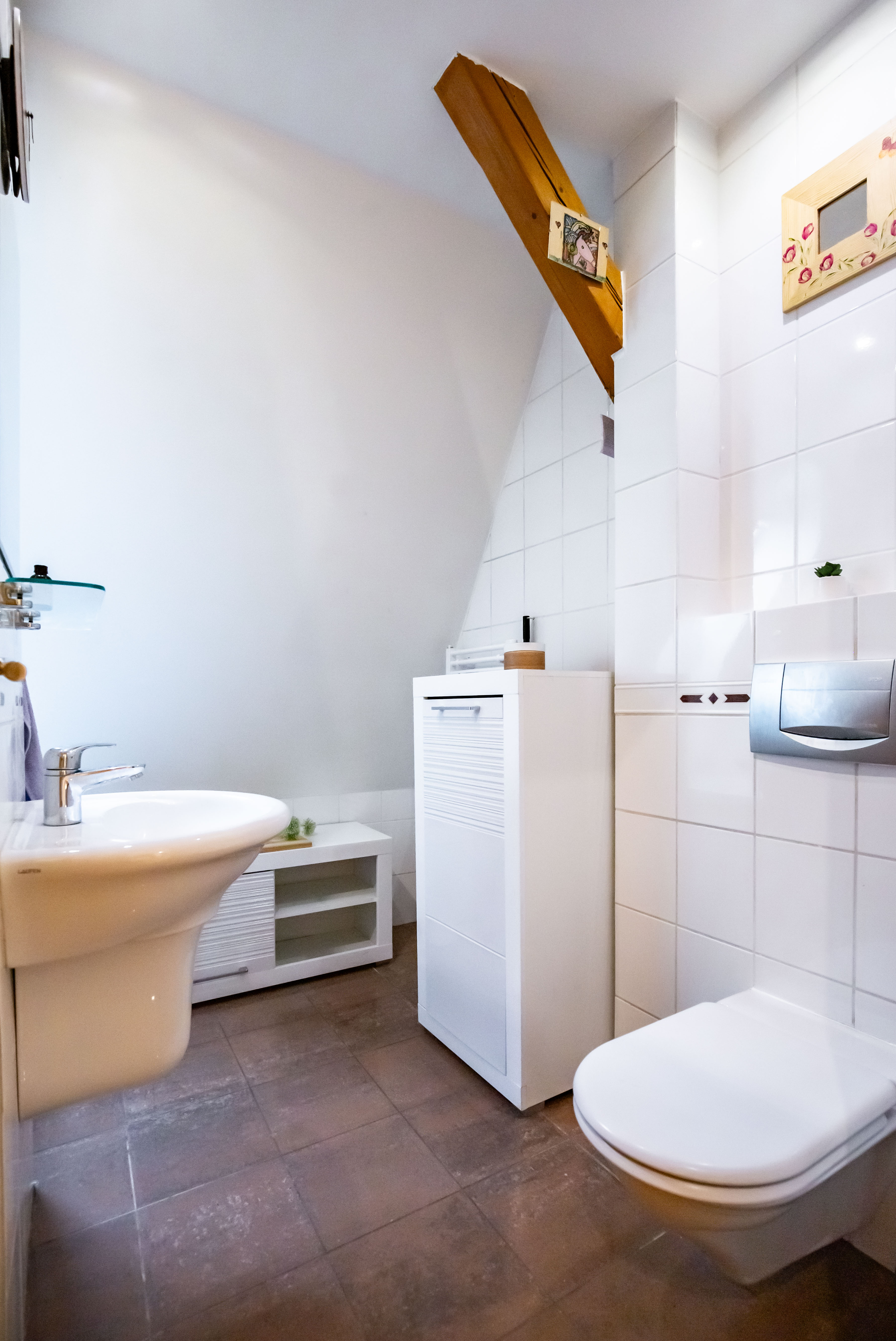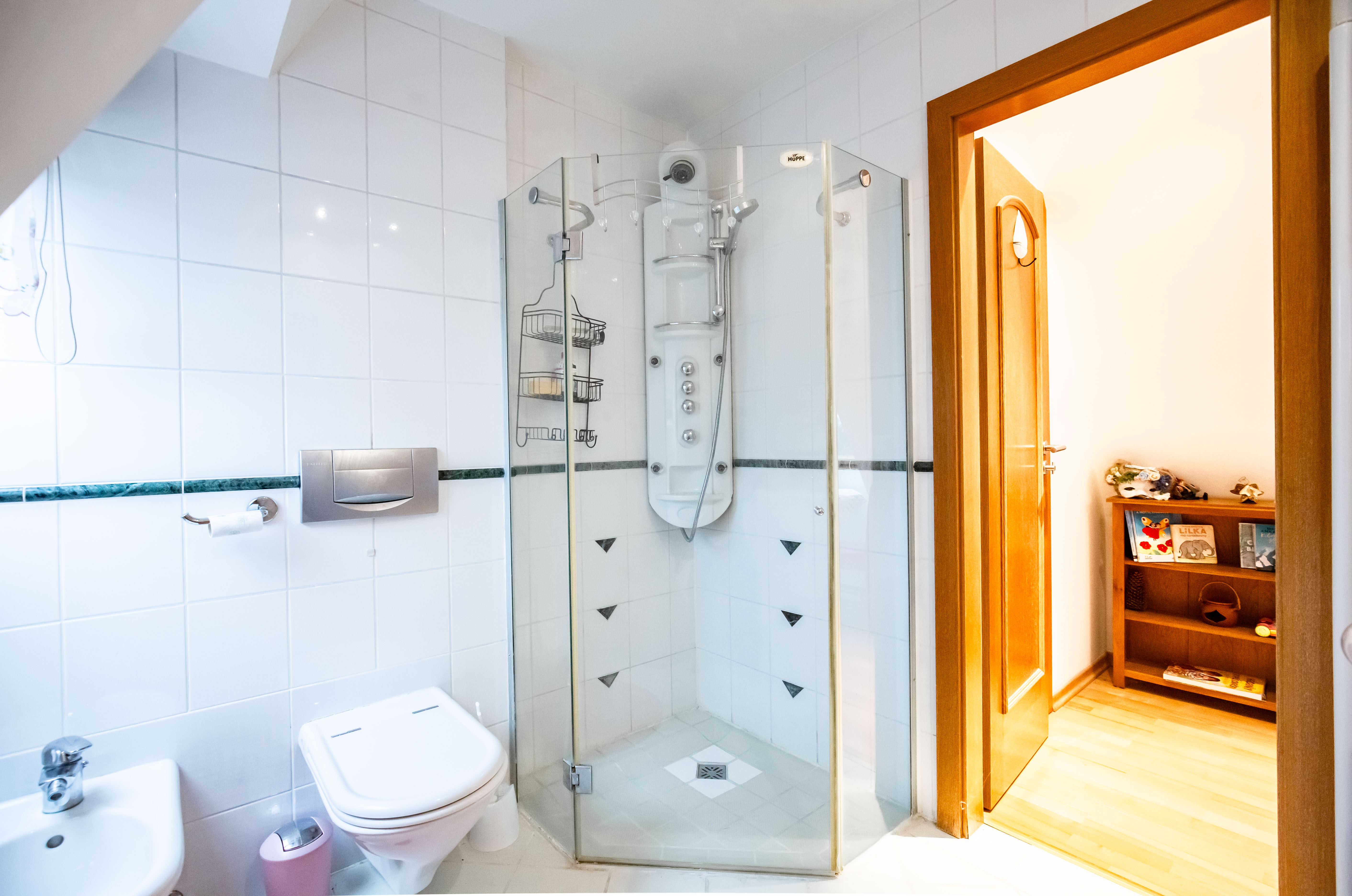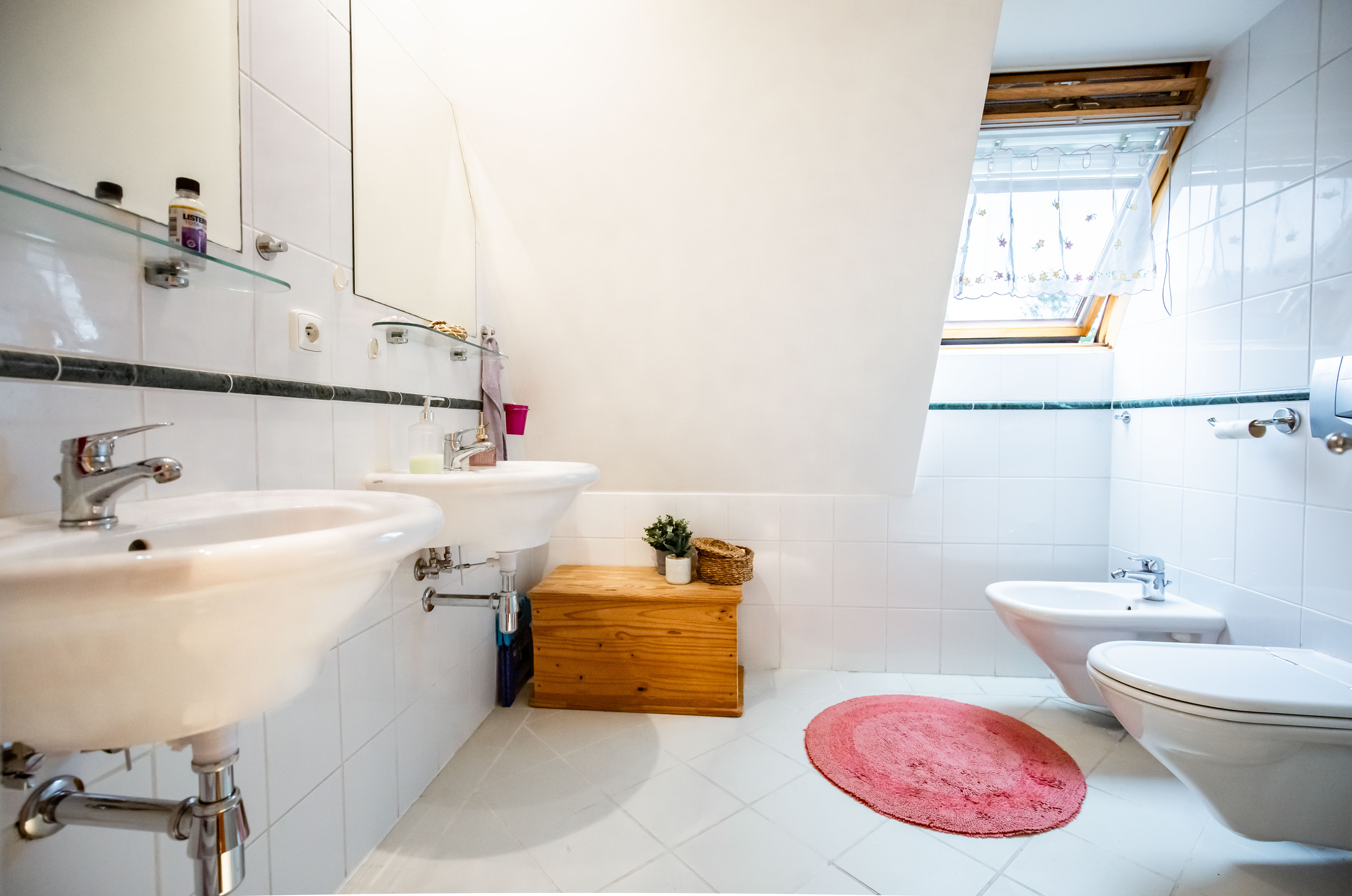 2.podlažie (40 m2): 2 detské izby, jedna aj so šatníkom, kúpeľňa so sprchovacím kútom, WC, bidetom a 2 umývadlami.