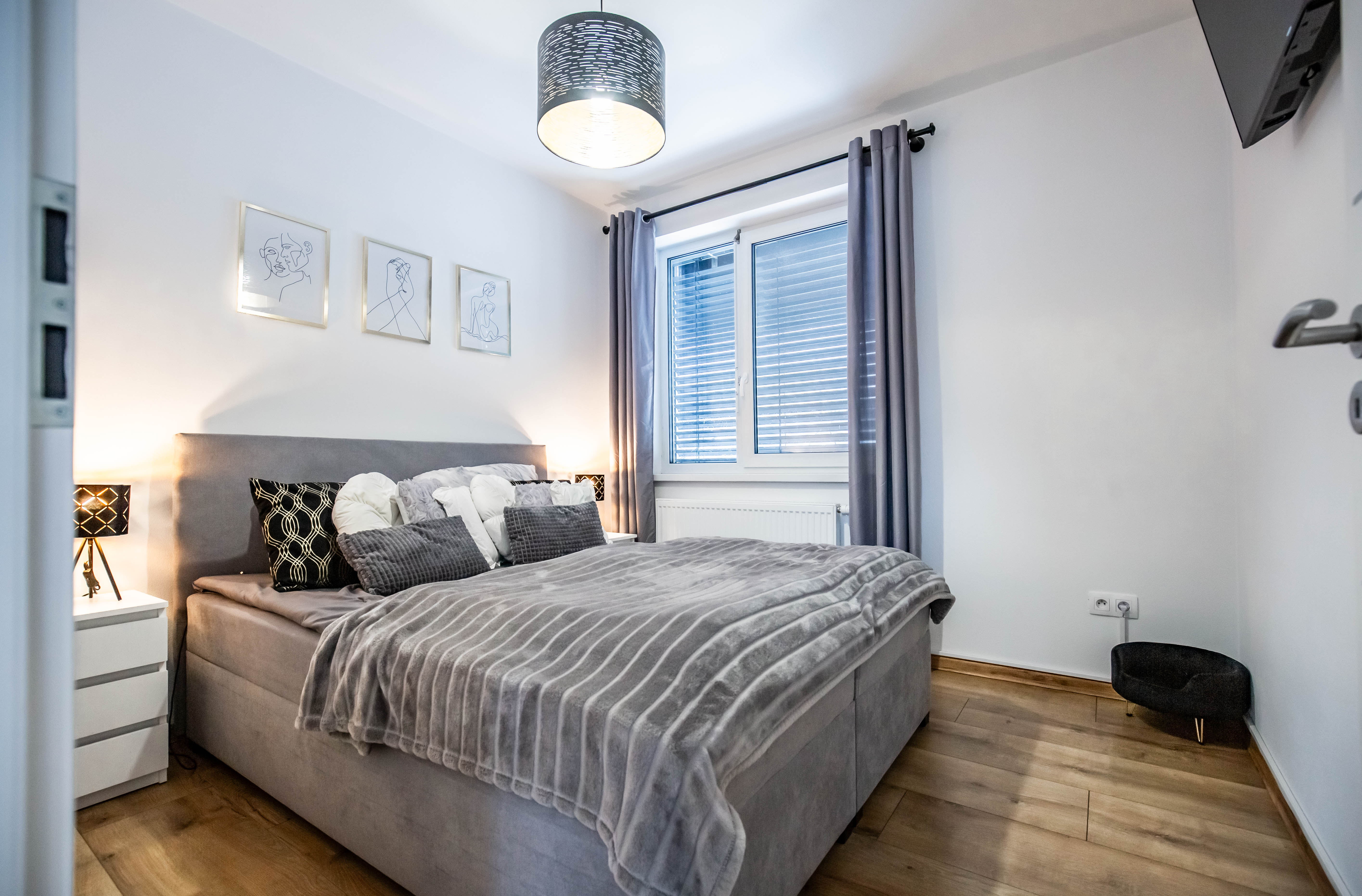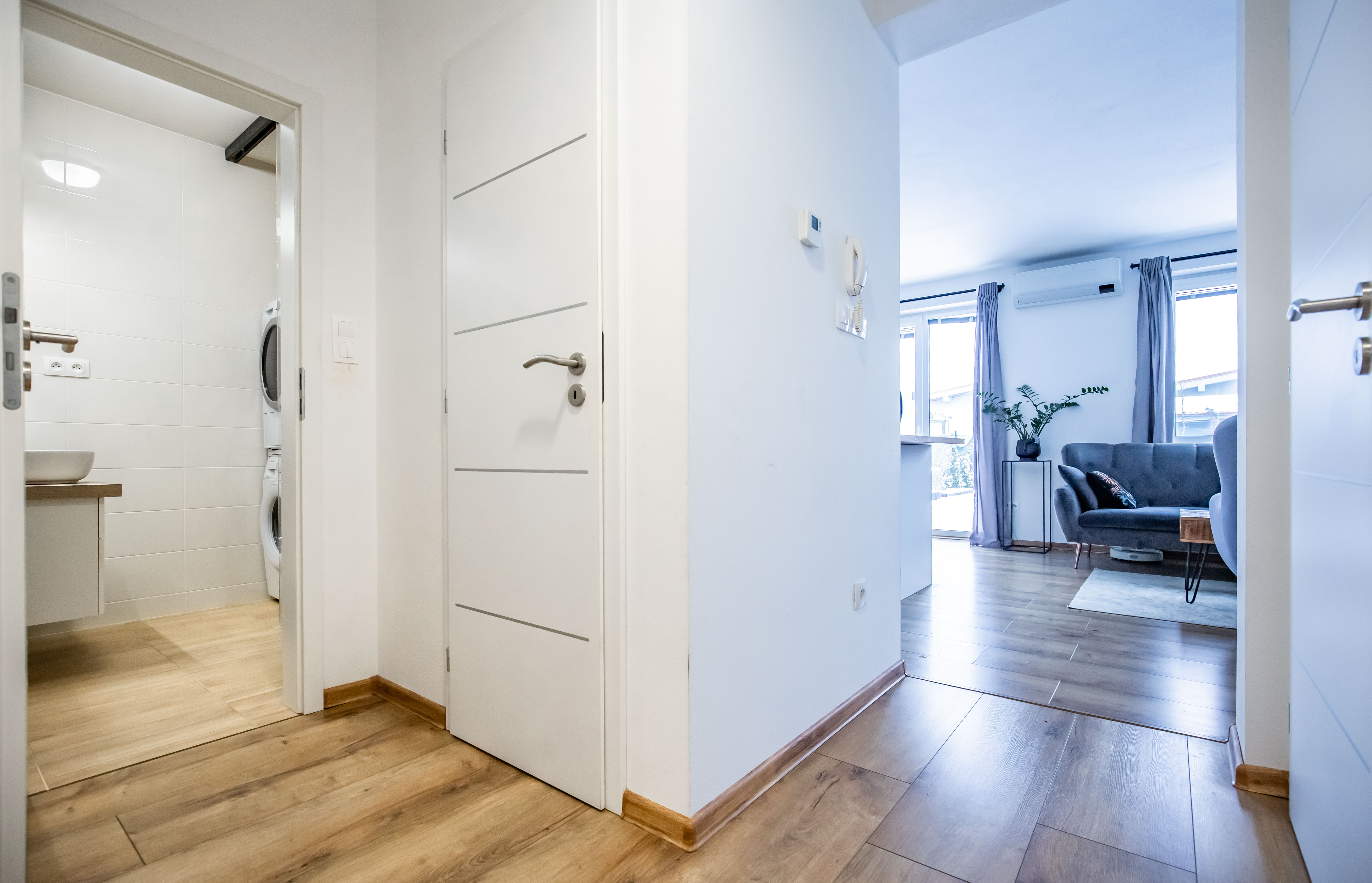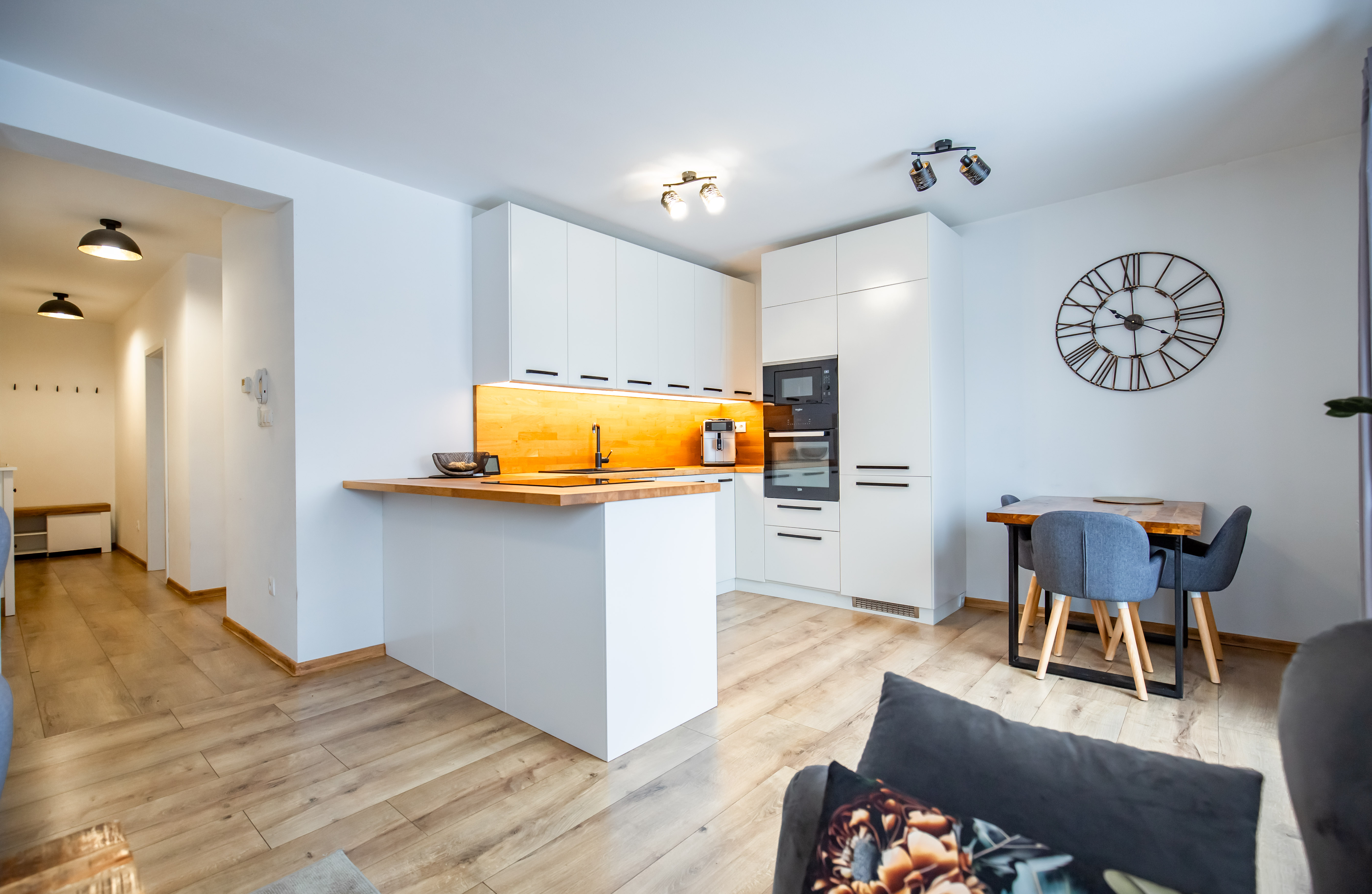 V celom byte sú plastové okná so žalúziami a sieťkami proti hmyzu, v detskej izbe a v spálni sú vonkajšie hliníkové žalúzie, plávajúca podlaha, kuchynská linka robená na mieru so zabudovanými spotrebičmi (indukčná varná doska, elektrická rúra, umývačka riadu, chladnička s mrazničkou, mikrovlnná rúra), interiérové dvere a zárubne, klimatizácia v obývačke, protipožiarne vchodové dvere. Kúrenie a ohrev teplej vody je zabezpečený spoločným plynovým kondenzačným kotlom nachádzajúcim sa na hornom poschodí v technickej miestnosti. Byt sa predáva čiastočne zariadený po dohode.