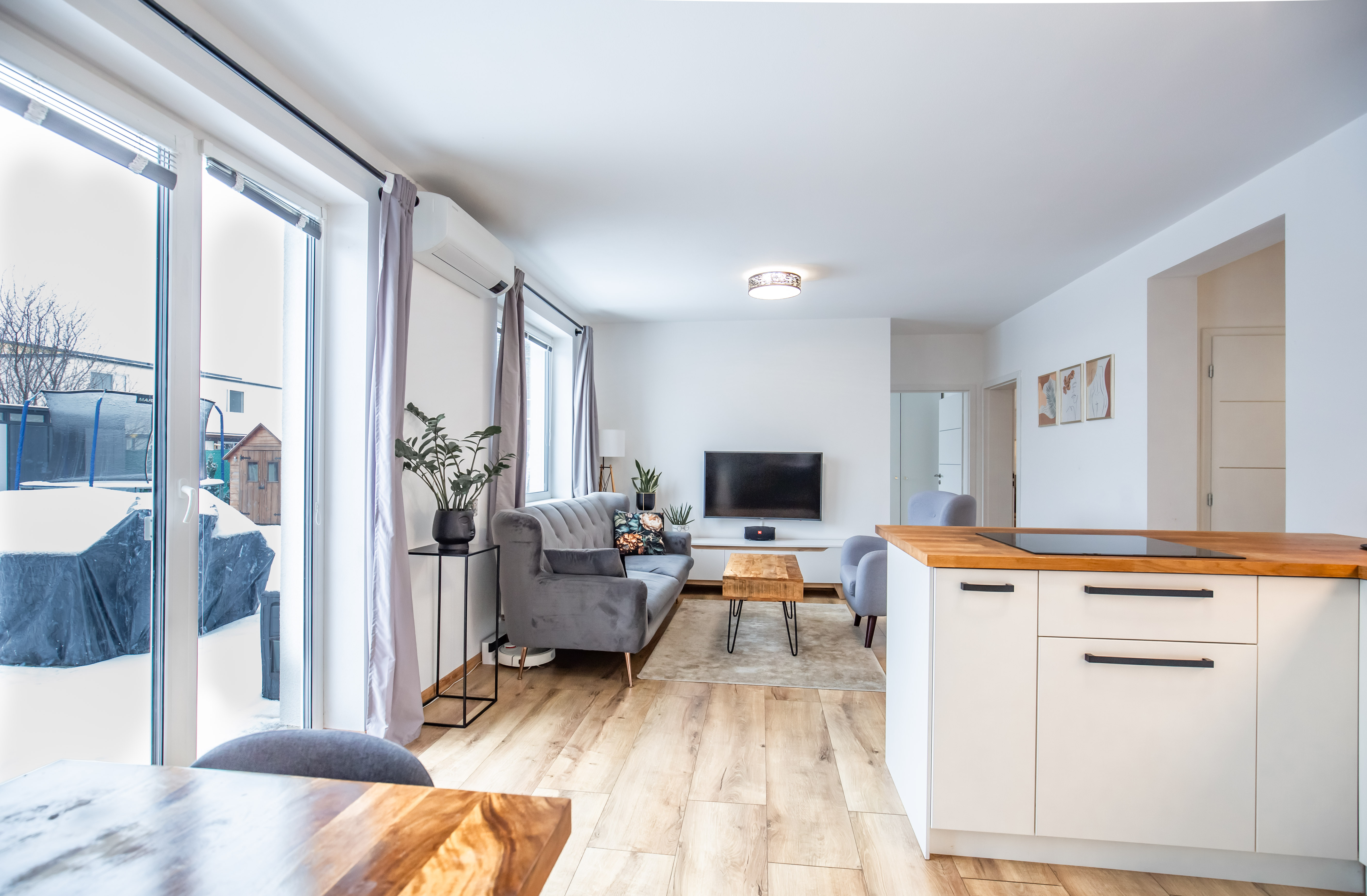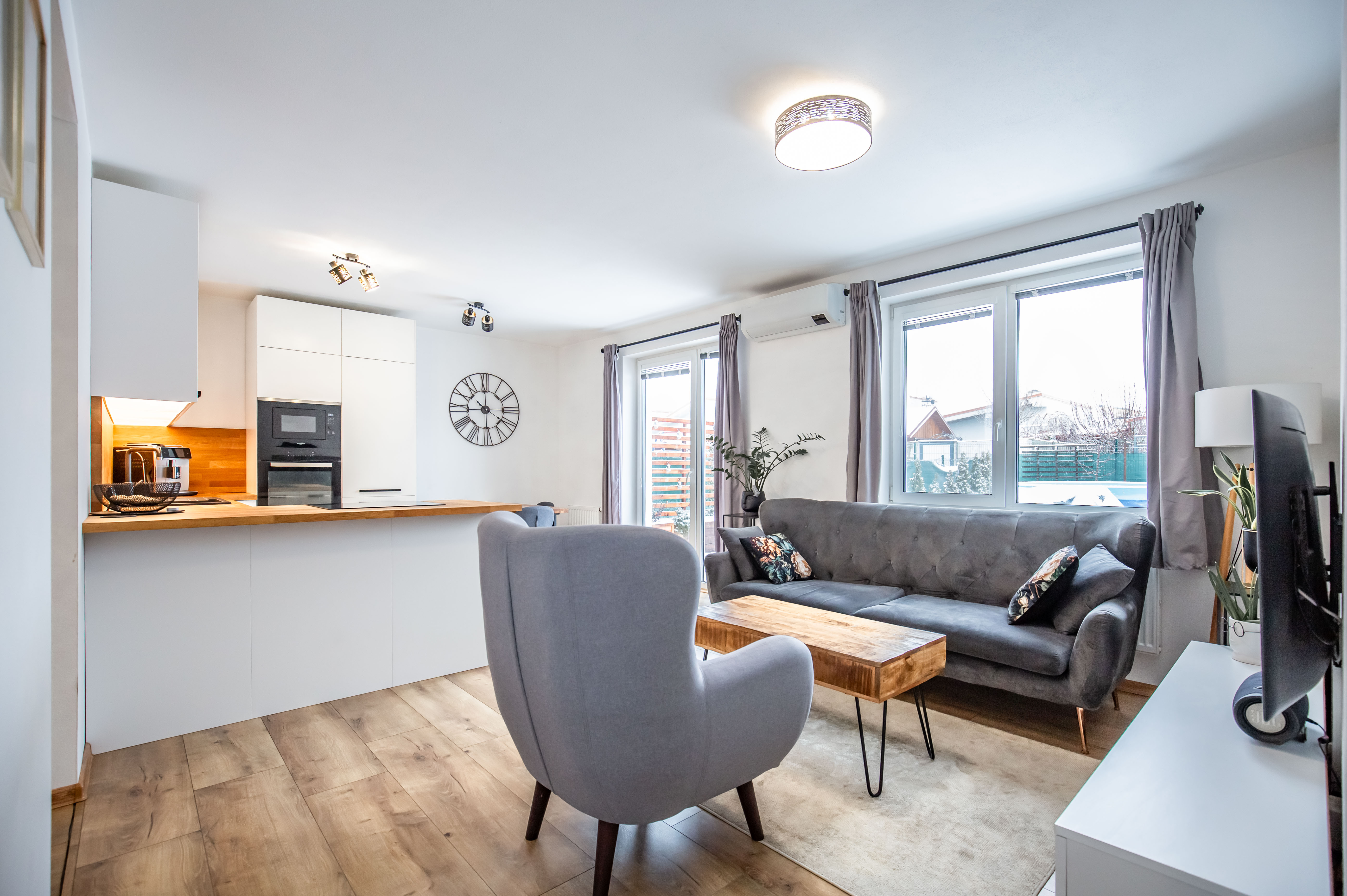 spracovacím kútom, samostatnej toalety, kuchyne prepojenej s obývacou izbou s výstupom na terasu a do záhradky, spálne a pracovne.