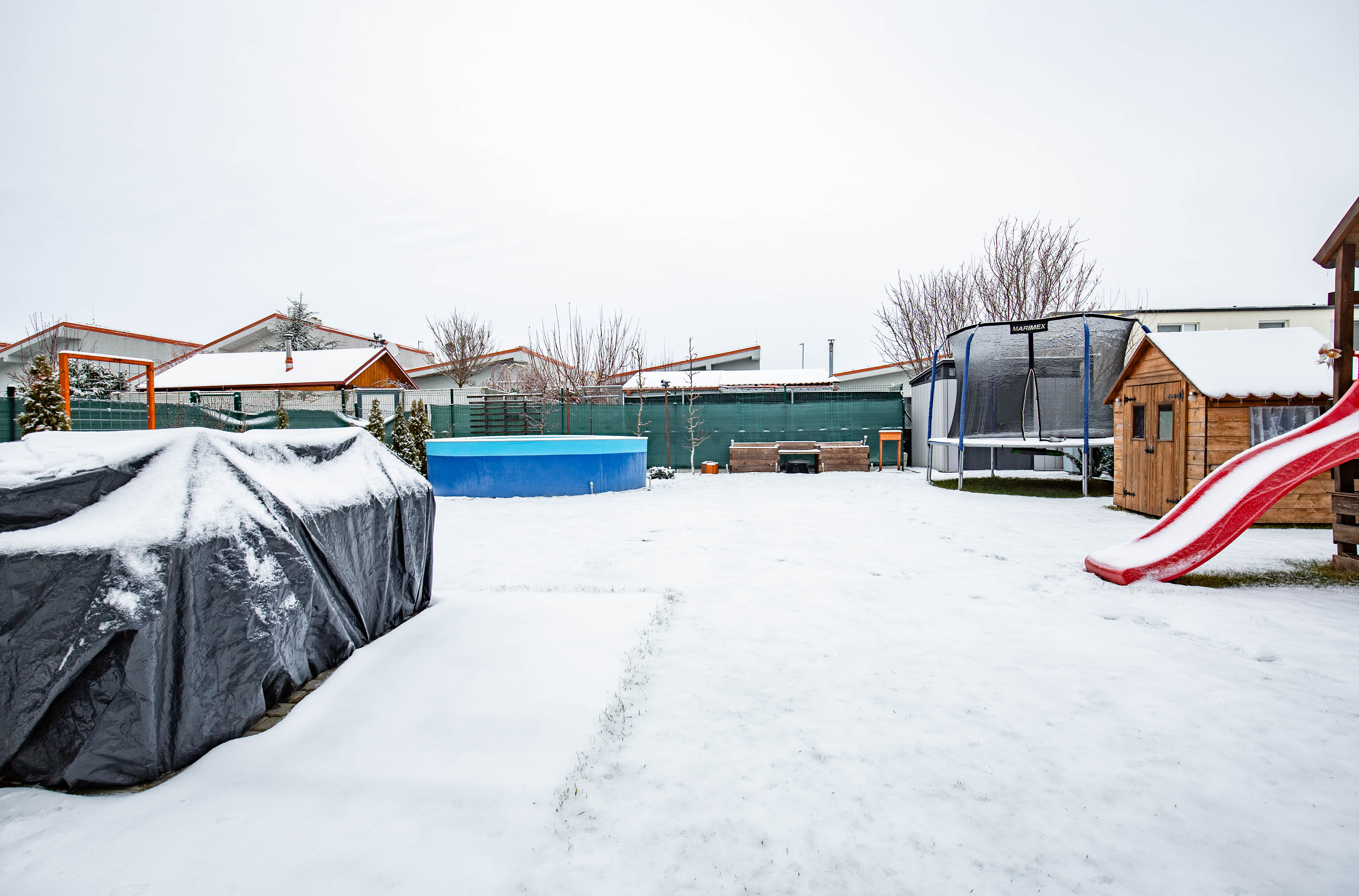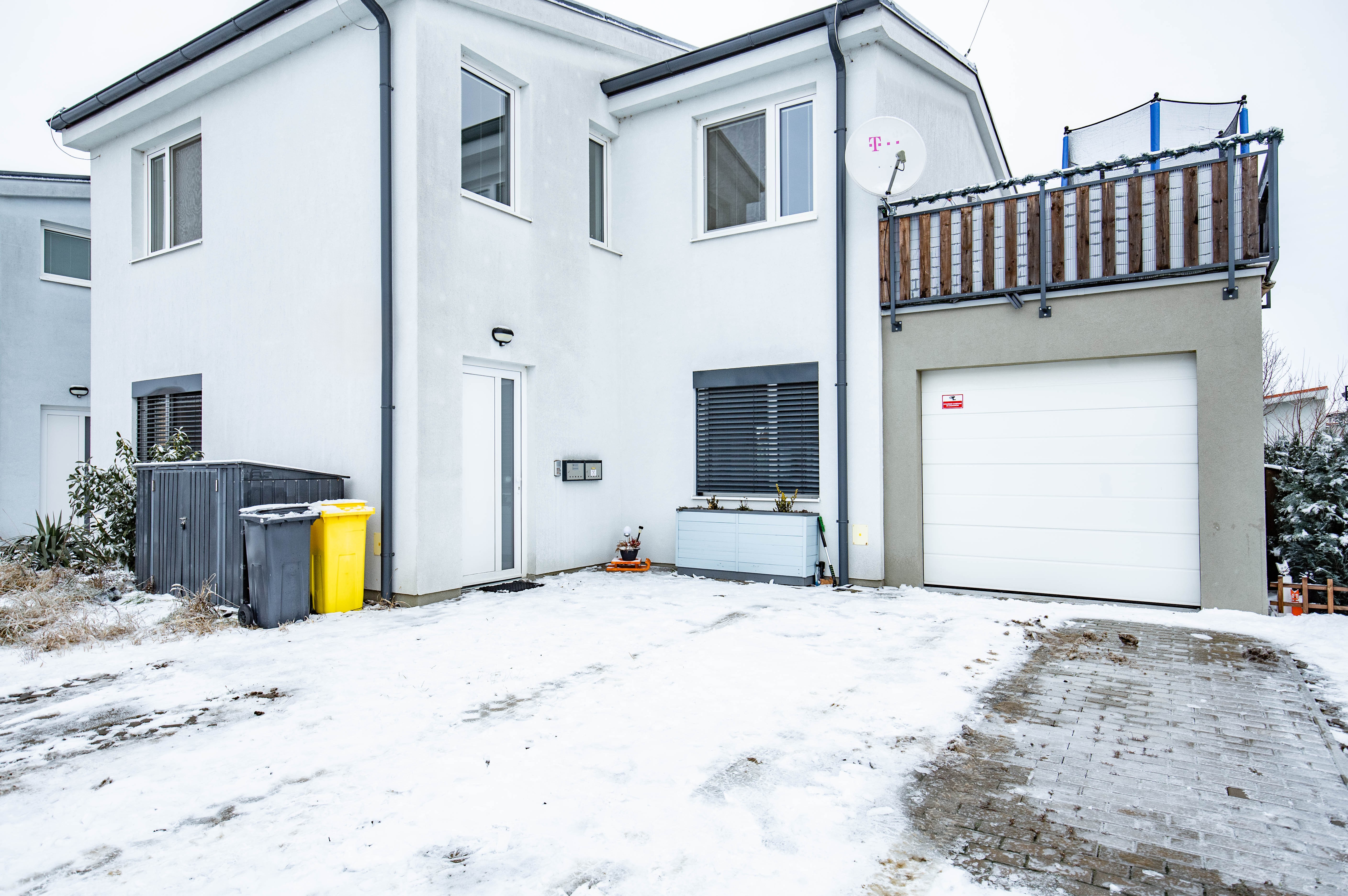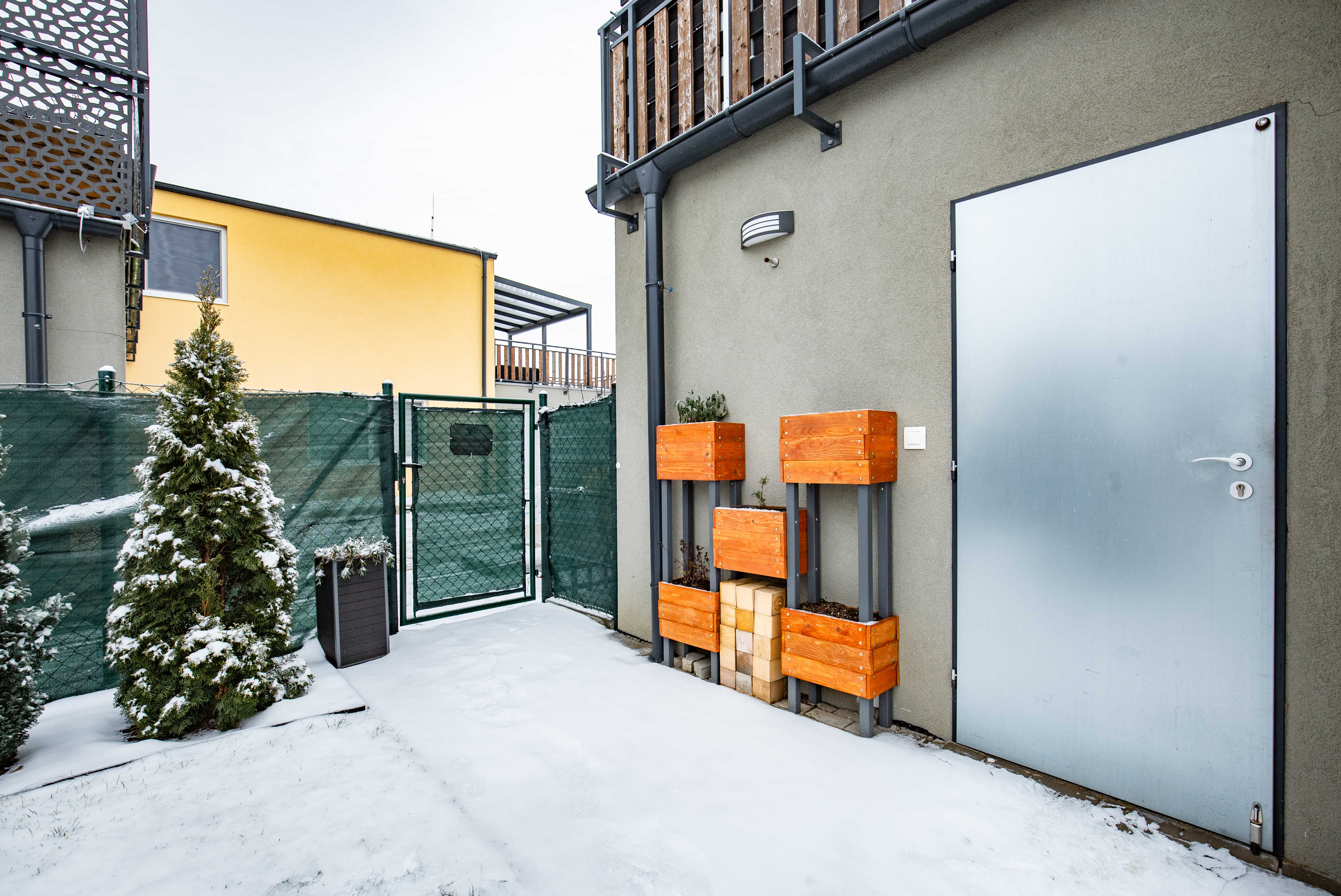 Byt sa predáva aj s garážou o výmere 18,95 m2 a parkovacím miestom pred garážou (parkovanie aj pre dve autá). Vstup do garáže je možný aj zo záhradky. Na záhradu je vyvedená voda, elektrina, nainštalovaná je automatická závlaha a natiahnutý ohraničujúci vodič pre robotickú kosačku. Záhrada je v lete slnečná, ale na terase je od obeda tieň. Na pozemku je k dispozícii krb na letné grilovačky, bazén, záhradný domček na uskladnenie náradia, trampolína, detský domček a detské malé ihrisko.