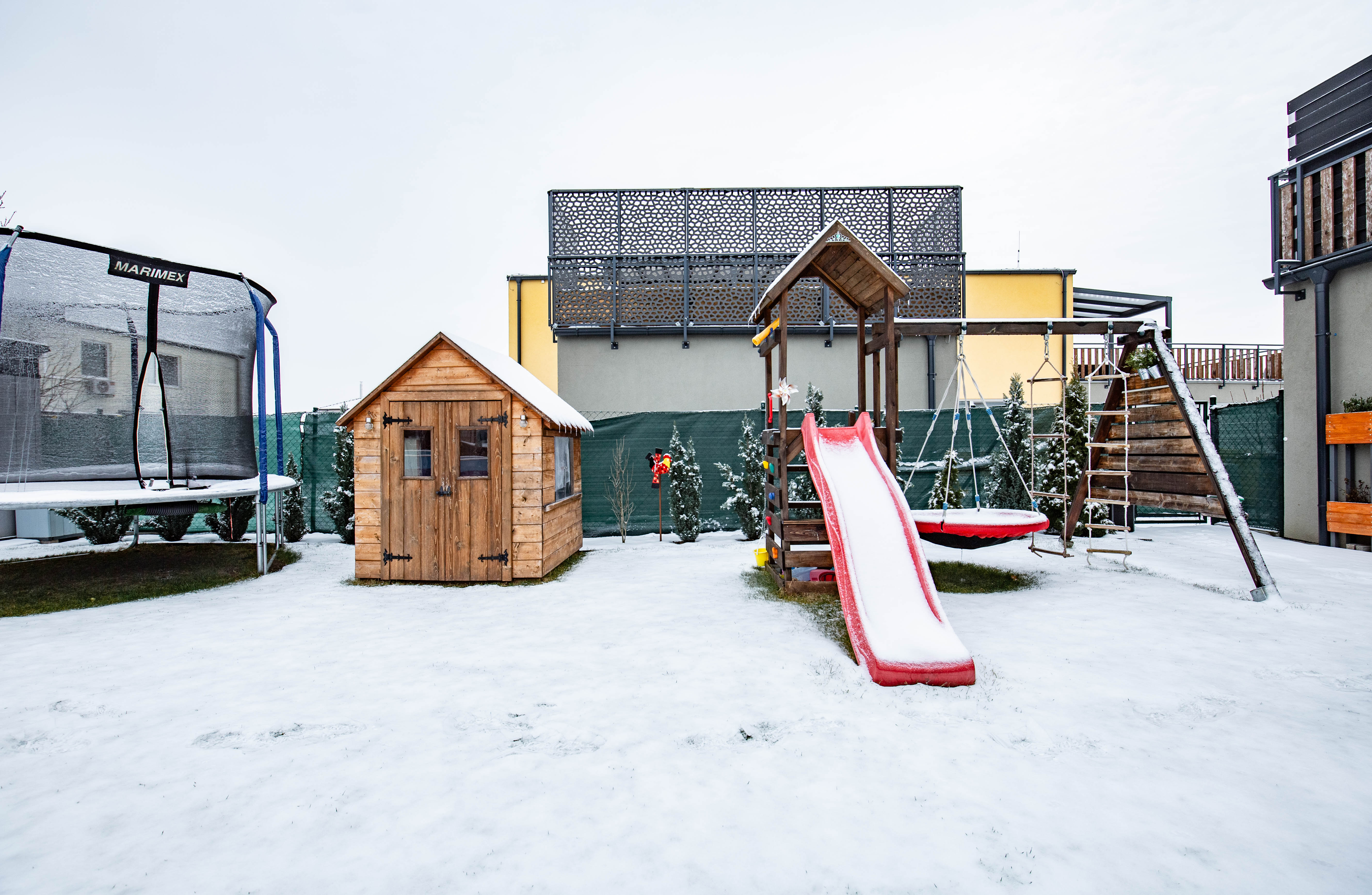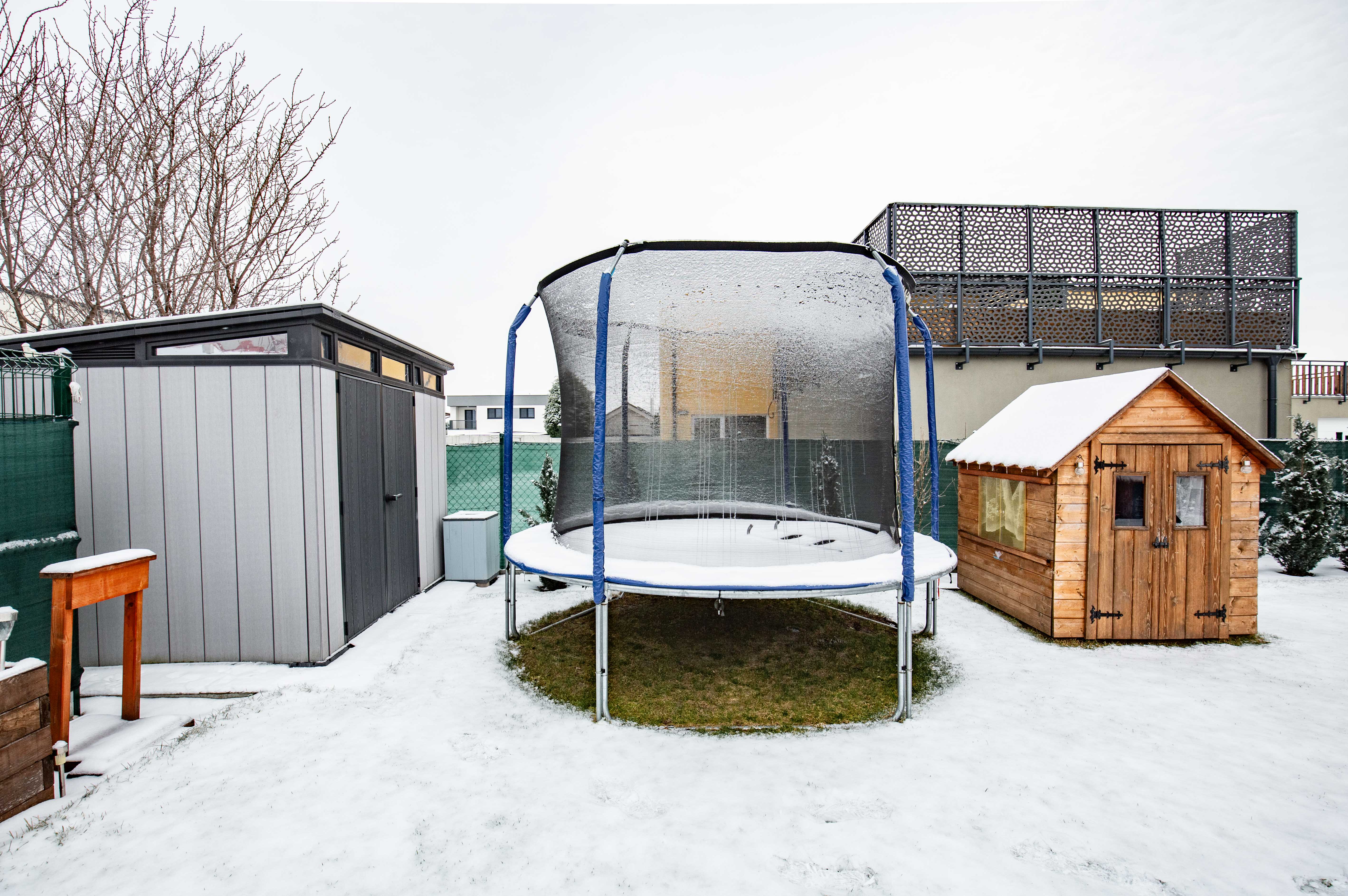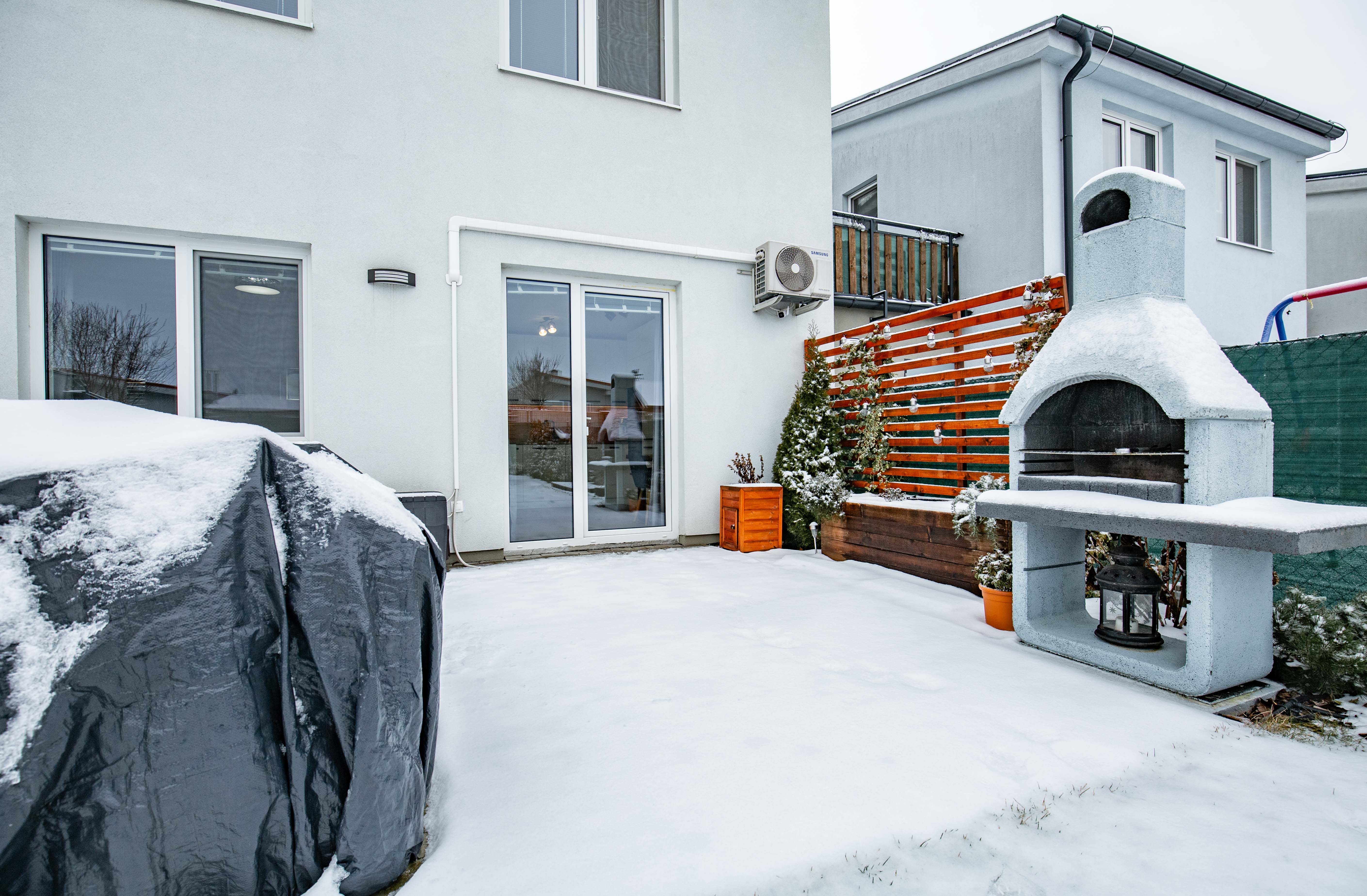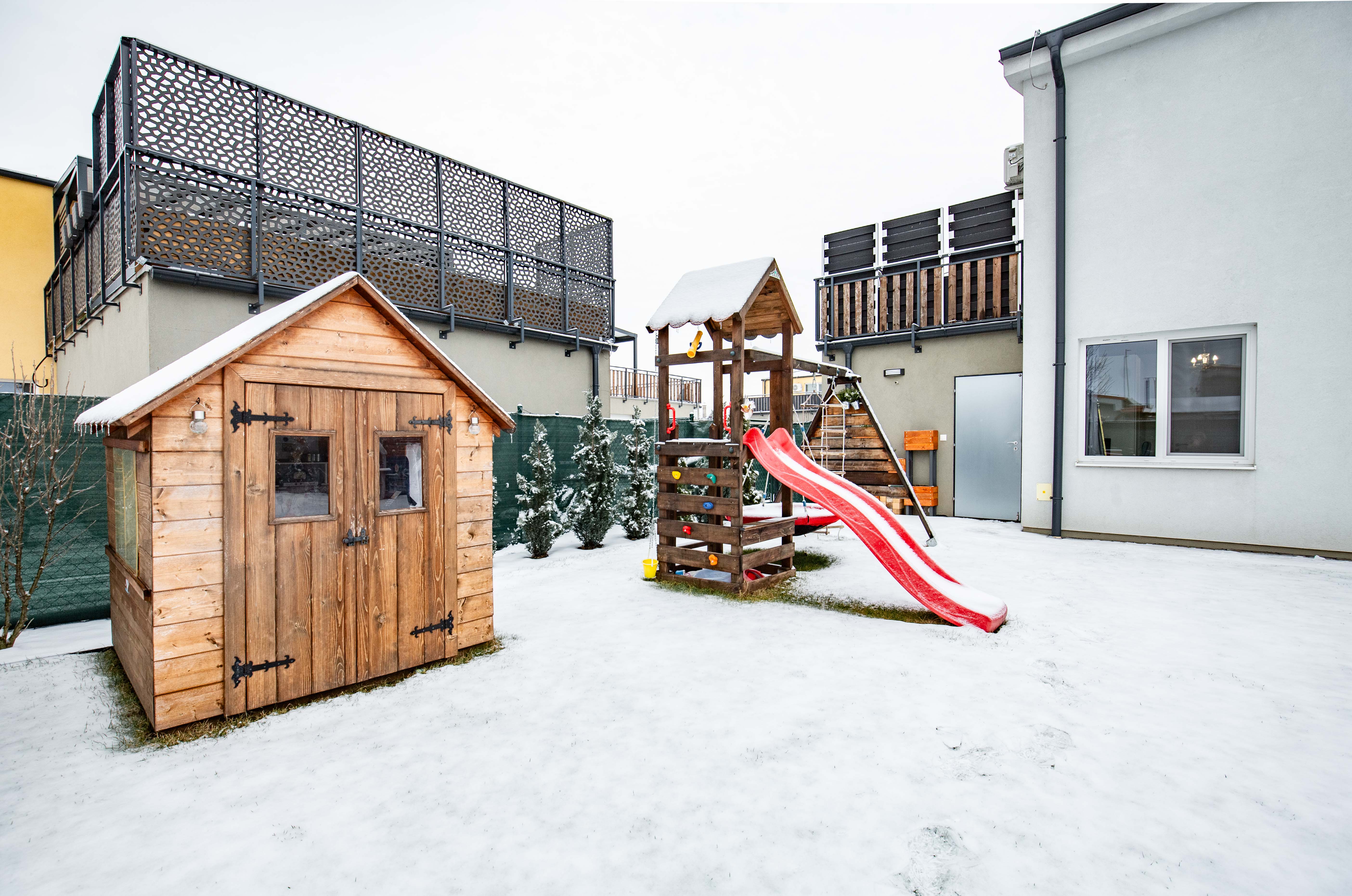 Byt sa predáva aj s garážou o výmere 18,95 m2 a parkovacím miestom pred garážou (parkovanie aj pre dve autá). Vstup do garáže je možný aj zo záhradky. Na záhradu je vyvedená voda, elektrina, nainštalovaná je automatická závlaha a natiahnutý ohraničujúci vodič pre robotickú kosačku. Záhrada je v lete slnečná, ale na terase je od obeda tieň. Na pozemku je k dispozícii krb na letné grilovačky, bazén, záhradný domček na uskladnenie náradia, trampolína, detský domček a detské malé ihrisko.